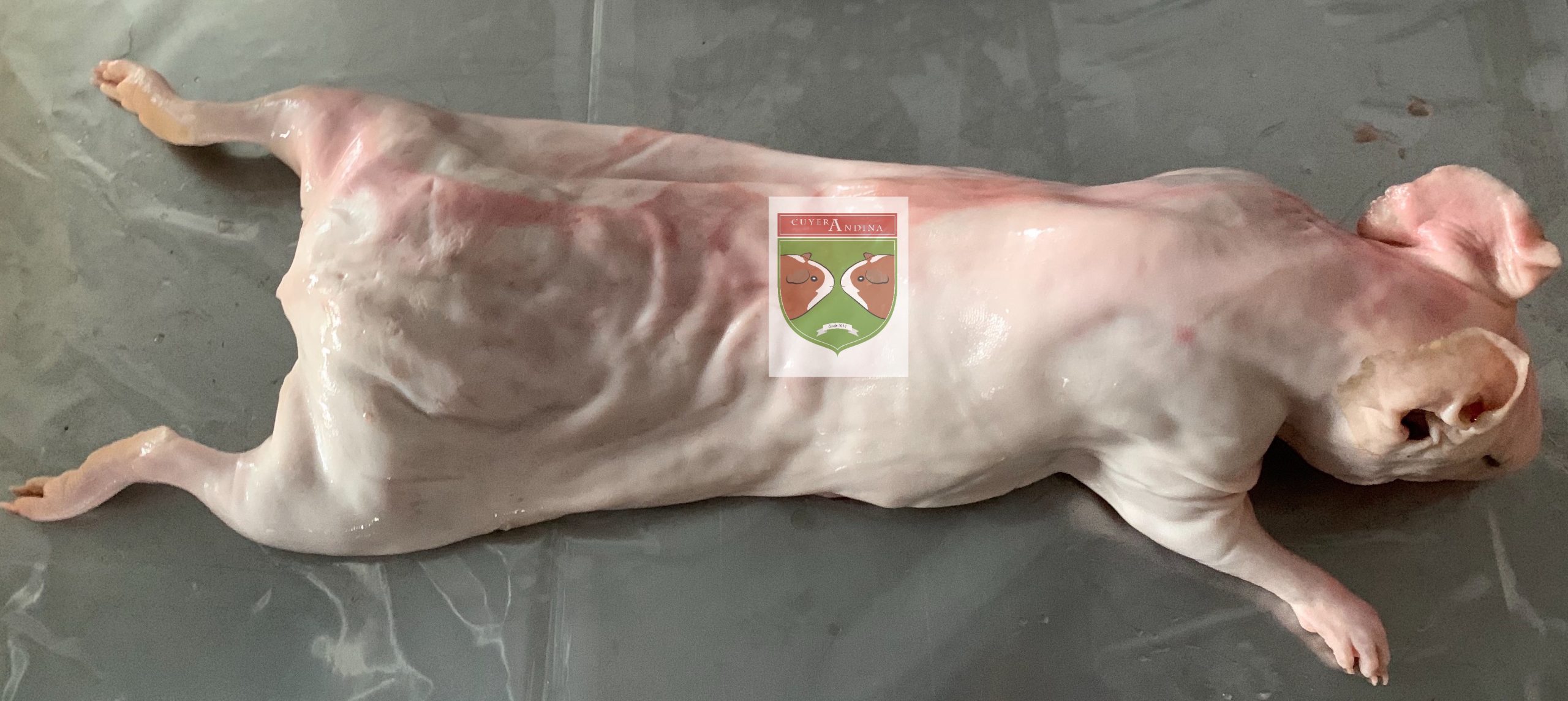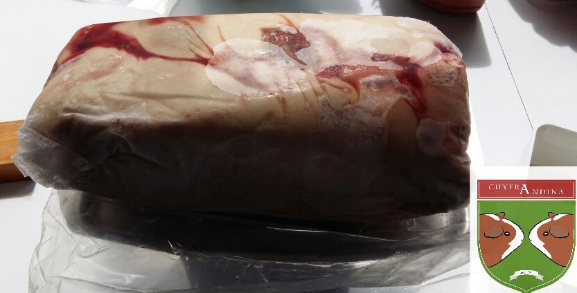 Cuy congelado en empaques de 2 unidades. Peso aproximado de 850 g a 900 g por unidad.